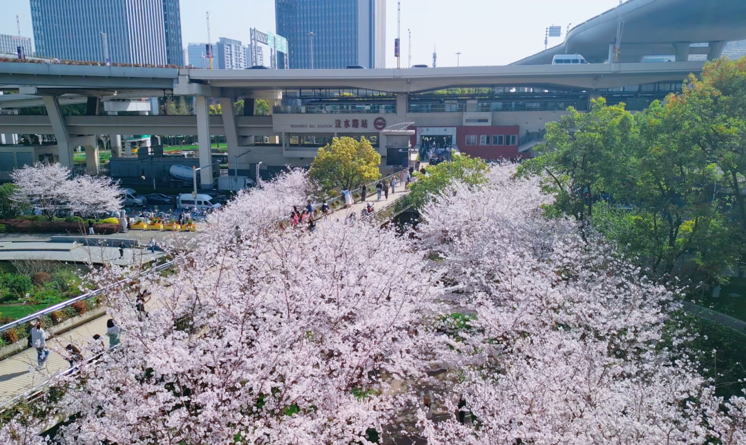 从汶水路四号口出站,就能看见染井吉野在静安中环公园如云霞般绽放,在车水马龙的高架桥下装饰出一个梦幻世界。