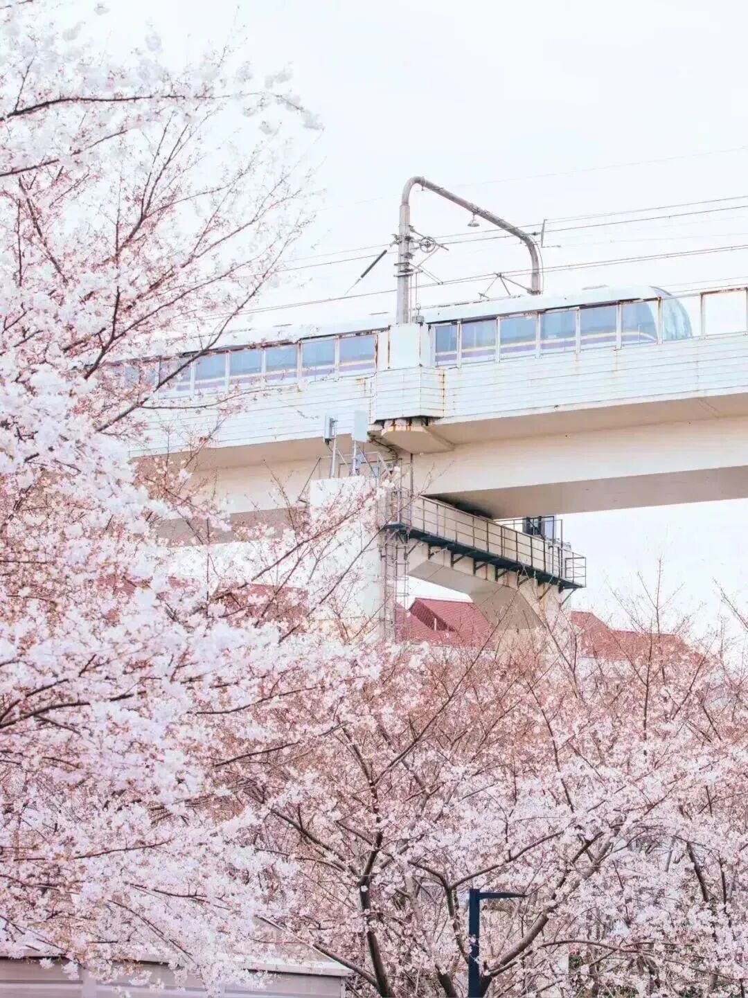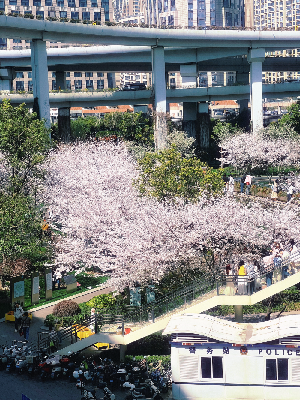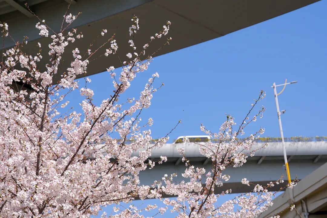 小贴士: 建议从天桥向下俯拍,可以拍到樱花、高架与城市车流同框的画面,很有《秒速五厘米》的既视感。